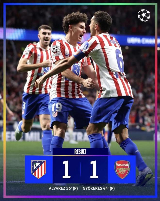 然而,下半场易边再战后,马竞发起了排山倒海般的攻势,格列兹曼的射门不幸击中横梁,卢克曼也在禁区中心错失了本该进球的良机。马竞的压力在第56分钟收到回报,本·怀特在禁区内被判定手球,阿尔瓦雷斯点射建功,将比分扳平。